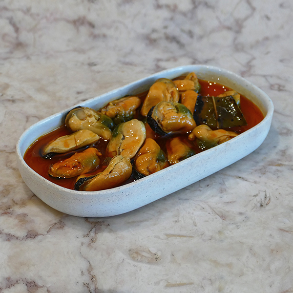 64% Midii (Mytilus Galloprovincialis), 20% ulei de floarea soarelui, 9% otet din vin (sulfiti), 3% usturoi, 2% frunze de dafin, 2% condimente.